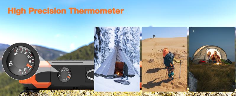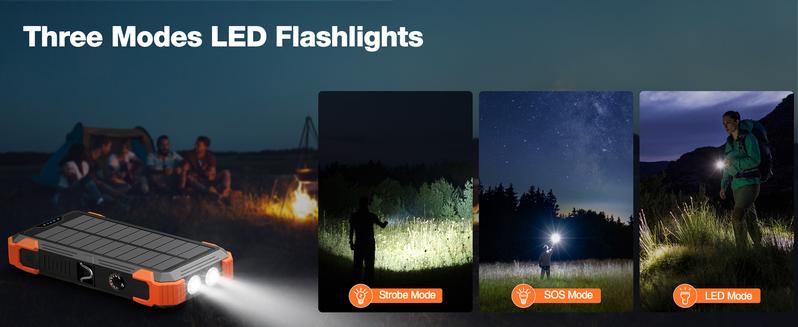 Sturdy&Durable Design for OutdoorThis solar battery pack is well made to be Waterproof/Shockproof/Dust-proof, which can withstand the harsh environment outdoors. It’s equipped with Dual super bright LED lights, a Must-Have tool for outdoor activities and home emergencies.